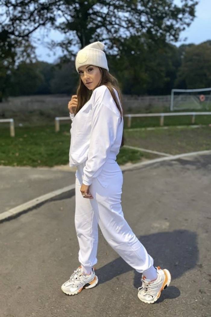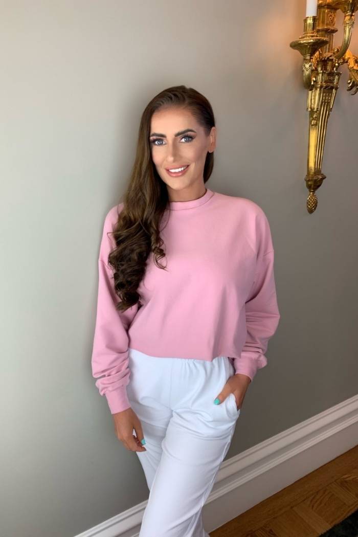 The ‘Carrie’ Sweats Set is a super plush sweatshirt and jogger set, now available for a huge discount in our Sample Sale in our Pink & White Fleece fabric.